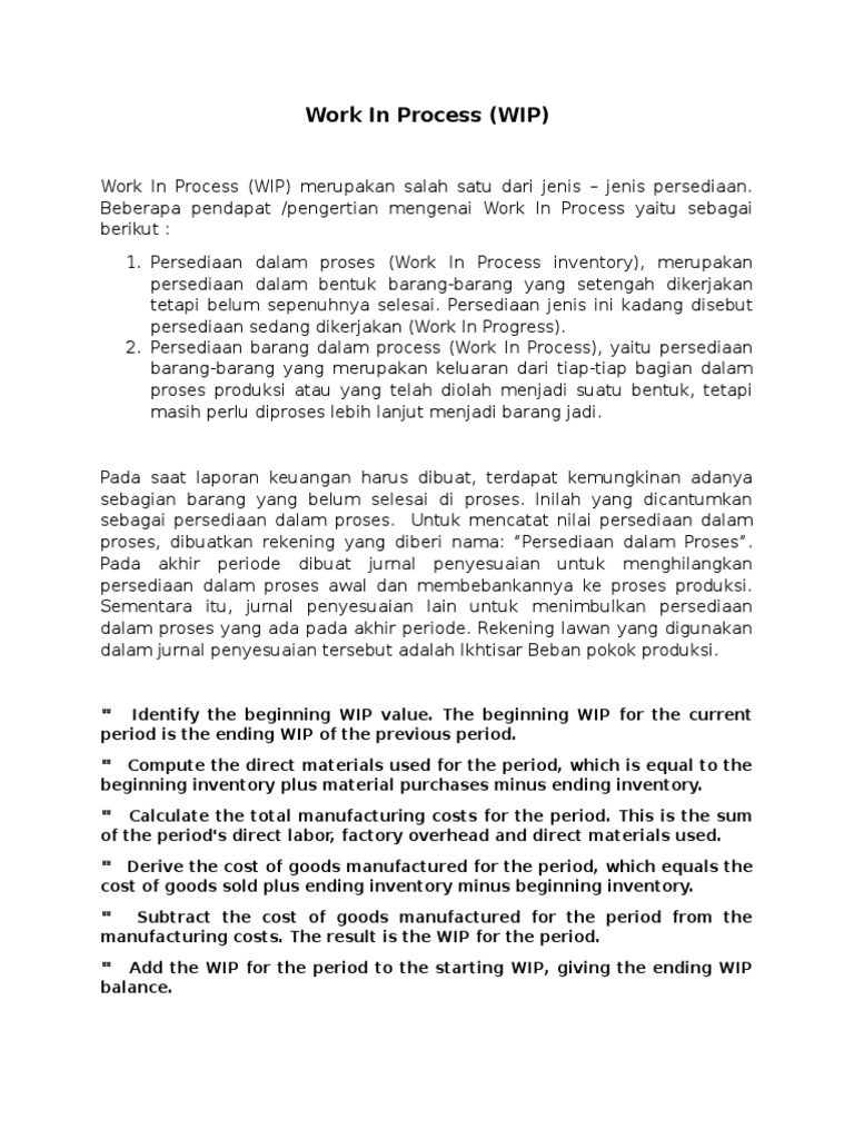 Artinya bahan baku masih memerlukan proses produksi lebih lanjut untuk menj See more. Goodswork in process inventory merupakan bahan baku yang sudah diproses sehingga menjadi barang dalam proses atau dikenal juga dengan nama barang setengah jadi. Work in process Ekonomi Bisnis biasanya ada dalam kamus atau glossary berikut ini untuk penjelasan apa.